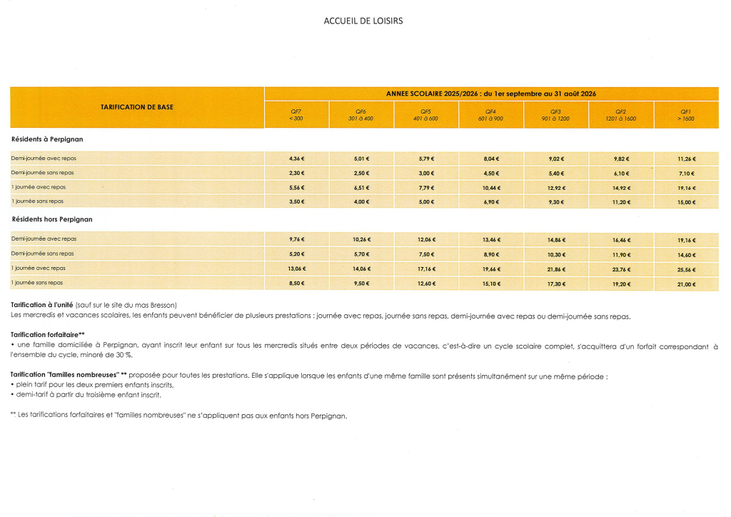 Tarifs des accueils de loisirs de la ville de Perpignan