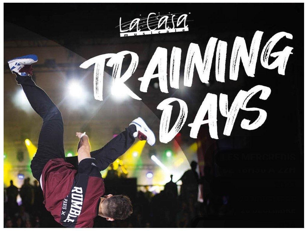 Le « Training Days » tient lieu de rendez-vous mensuel réservé aux danseuses et danseurs de tous les horizons et de tous les niveaux, même débutants. L’occasion pour les breakers, freestylers, lockers ou encore poppers de se réunir pour une session training au rythme des musiques (breakbeats, hip-hop, soul-funk, …).