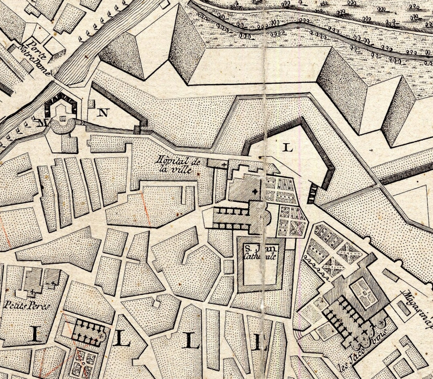 Si l’on ne sait rien de la structure de l’hôpital primitif, nous en avons un premier aperçu dans le plan relief. De plus, les documents retrouvés nous permettent aussi de nous faire une idée de son aspect par la suite, à partir du XVIIIe siècle.
