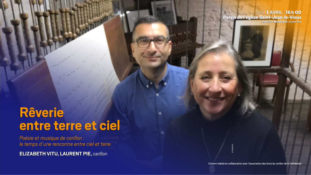 Poésie et musique de carillon : le temps d’une rencontre entre ciel et terre. La poésie, source d’inspiration des compositeurs d’hier et d’aujourd’hui, se mêlera avec subtilité aux airs du carillon. Elizabeth Vitu et Laurent Pie, interprètes émérites, élèvent jusqu’aux cieux les musiques de Francis Poulenc, Johann Sibelius et Jef Rottiers, au rythme du poème de Charles Baudelaire et nous ramènent sur notre Terre dans la paix. À travers une large palette de couleurs musicales, ils nous offrent avec passion la rêverie qui les traverse.
