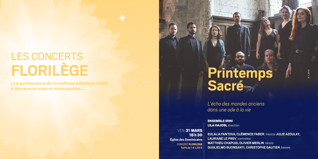 Sans vous, cher public, le festival n’existerait pas avec une telle vitalité. Vous êtes revenus nombreux en 2022. Poursuivons ensemble le chemin parcouru pour faire du festival un lieu de rencontres ouvert sur un monde riche d’expressions artistiques et de découvertes musicales. Avec joie et impatience, toute l’équipe du festival vous donne rendez-vous pour vivre ensemble ces moments suspendus, magiques et exaltants que nous offrent la musique sacrée, source lumineuse d’émotions et de découvertes.