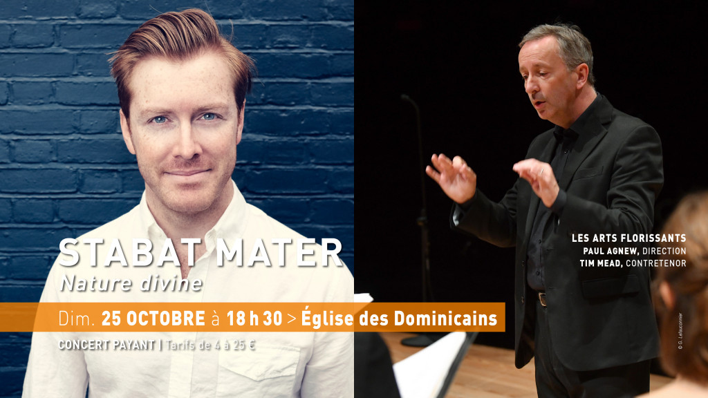 La soirée s’annonce pleine de grâce et de beauté. Paul Agnew et les Arts Florissants viennent faire une nouvelle escale au festival. L’église des Dominicains toute entière vibrera d’une seule émotion lorsque le contre-ténor Tim Mead et l’orchestre imposeront, sous la direction de Paul Agnew, la virtuosité au service d’une spiritualité intense. Le programme laisse une grande place à Antonio Vivaldi, compositeur vénitien, génial et célèbre pour l’immensité de son œuvre instrumentale et vocale, sacrée et profane. Des concertos pour violons et pour luth résonneront avec éclat et brio tandis que le Stabat Mater, motet pour voix seule, portera au paroxysme l’affliction et le recueillement. La gravité des paroles a inspiré Vivaldi. La musique colle au texte avec une coloration dramatique : un sommet dans le sentiment d’affliction et dans l’incitation à la méditation. Vivaldi connaissait et aimait la voix d’alto : dans cette œuvre, il exploite son timbre sombre portant l’émotion au paroxysme.  La musique déploie l’expression extraordinaire à la fois d’une spiritualité intense et d’une grande tristesse.