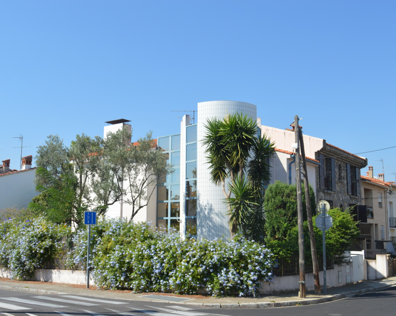 Description : Architecture moderne, avec une structure cylindrique au centre, les imbrications de formes géométriques et l'utilisation du verre.