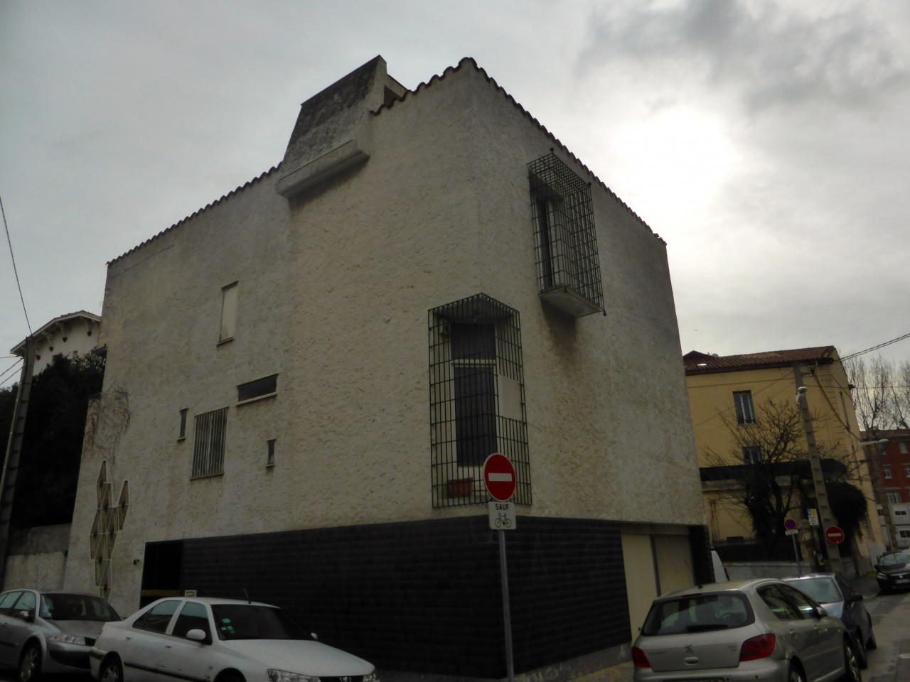 Description : Immeuble de style postmoderne : Toit terrasse, losanges décoratifs sur la façade de la rue de l’Avenir et menuiseries apparentes.