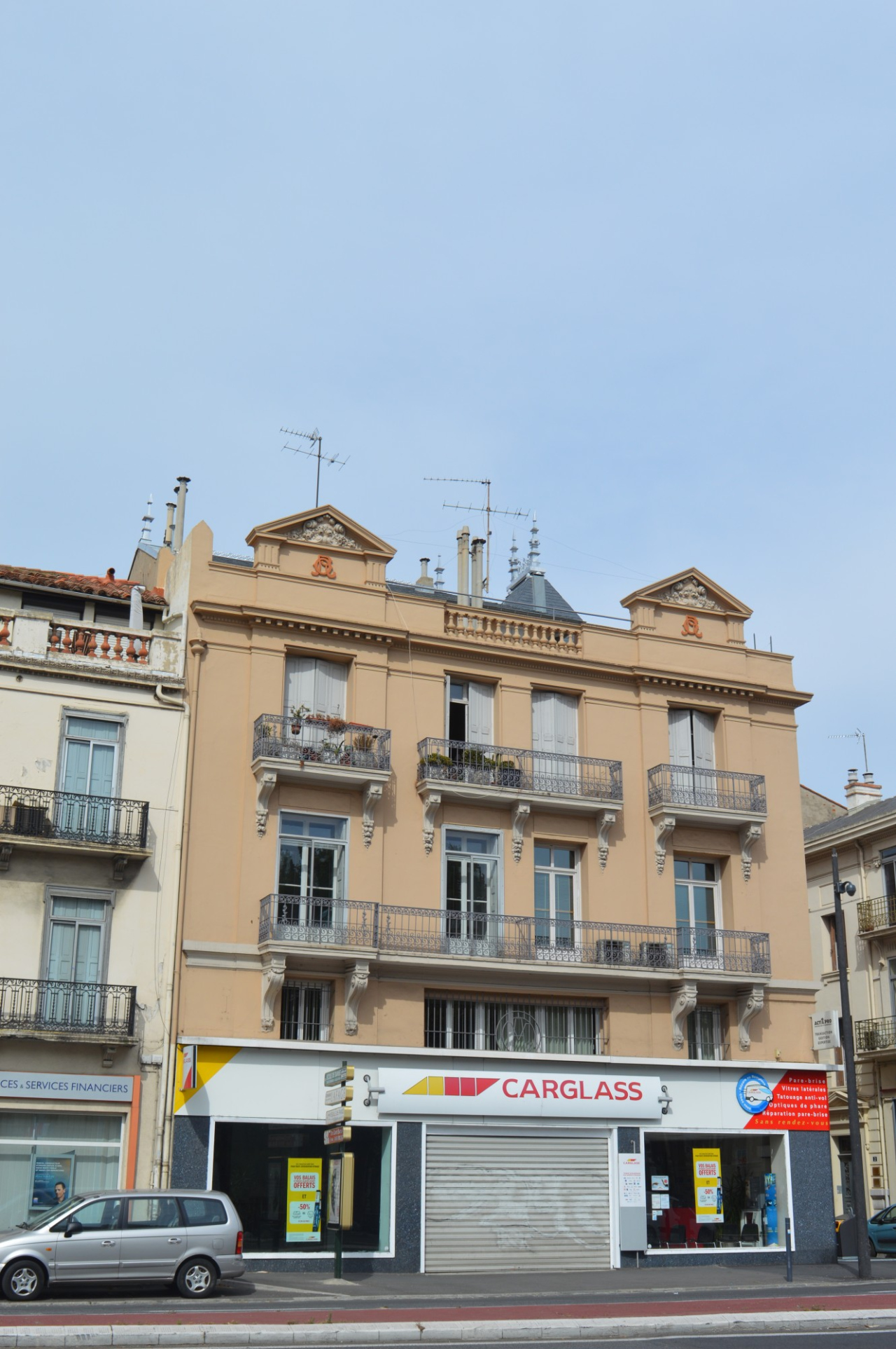 Description : Immeuble classique : Consoles décoratives, balcons en fer forgé, frontons décorés et denticules au dernier étage.