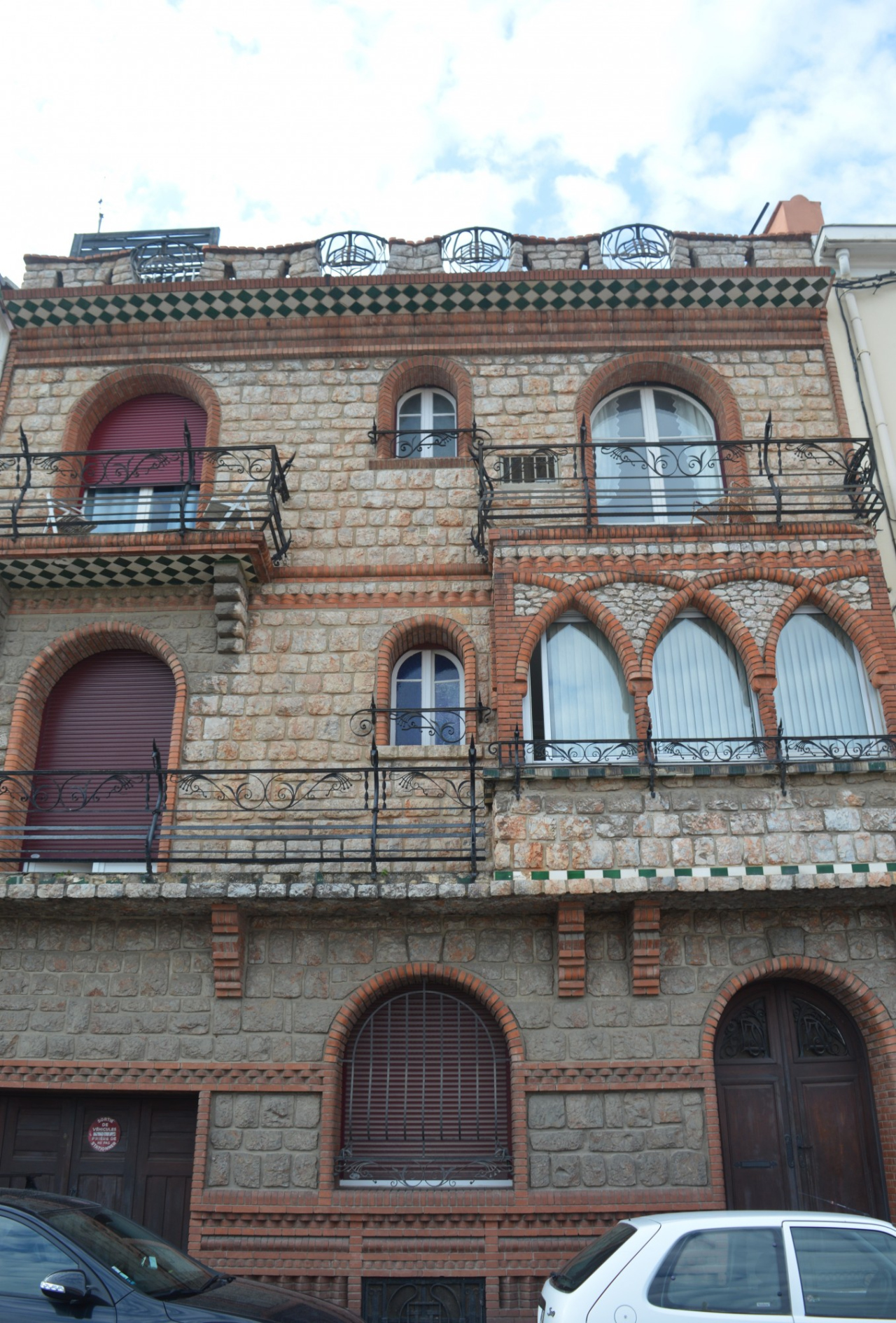 Description : Architecture éclectique avec les baies du bow-window en ogives, la façade en marbre et les élements décoratifs brique, balcons avec ferroneries stylisées.