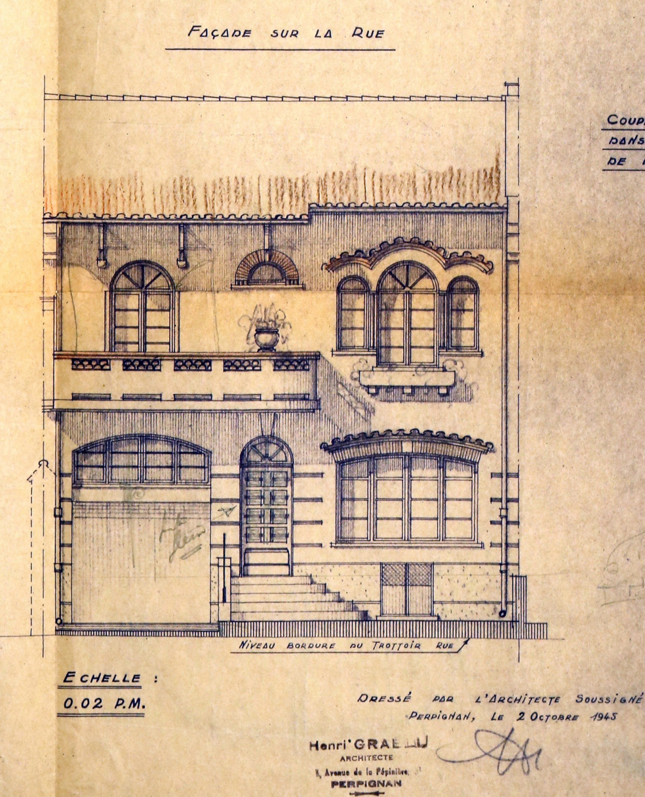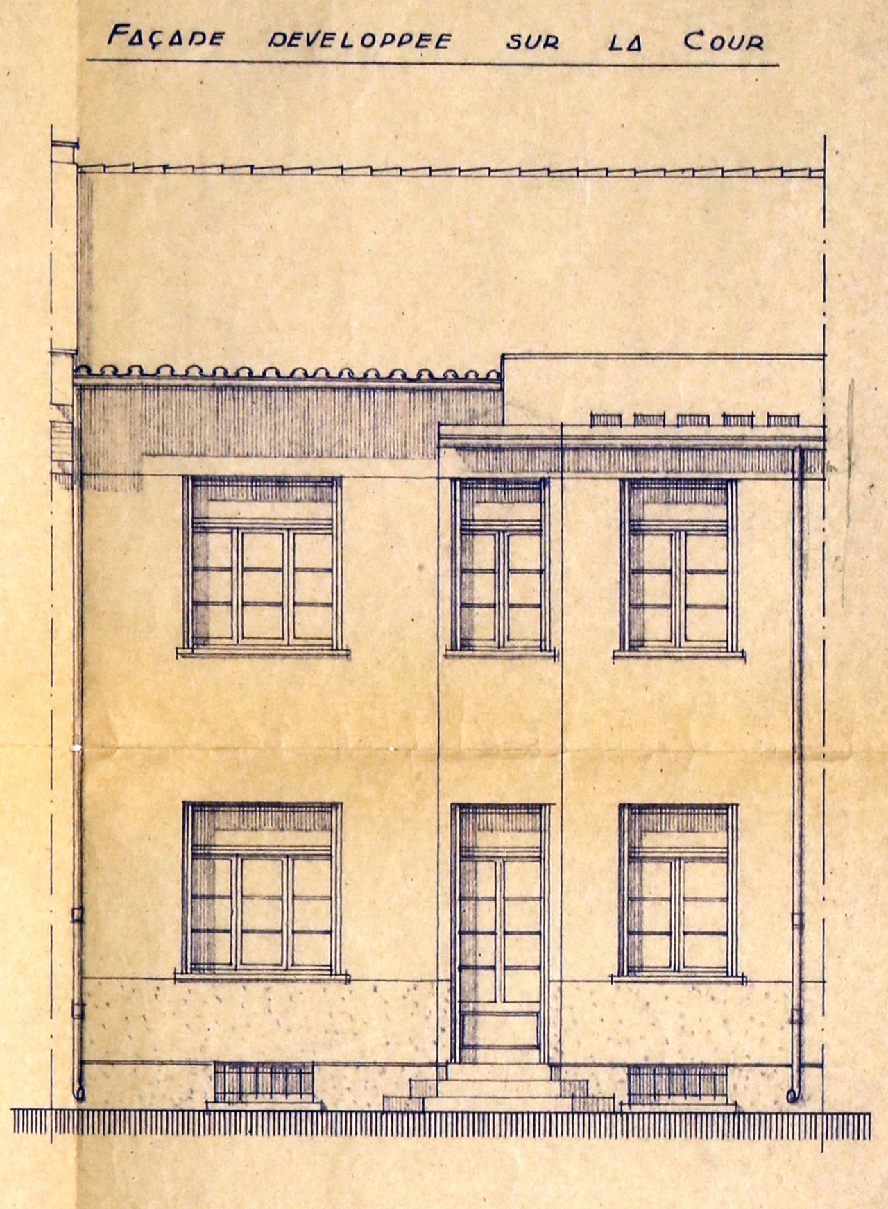 Description : Inspiration régionaliste : Triplet de baies romanes avec colonnettes au 1er étage, décoration de briques pour les arcades.