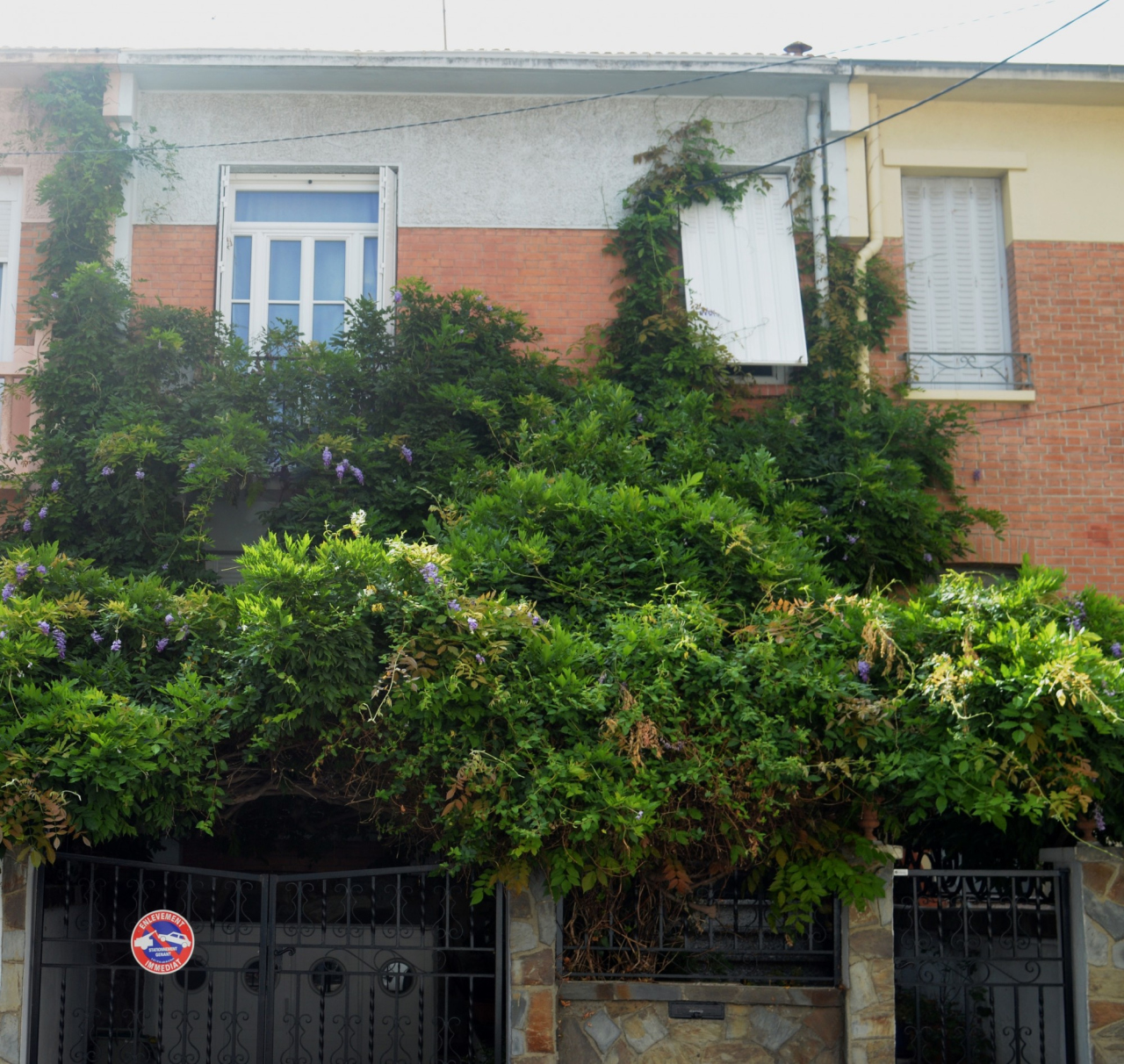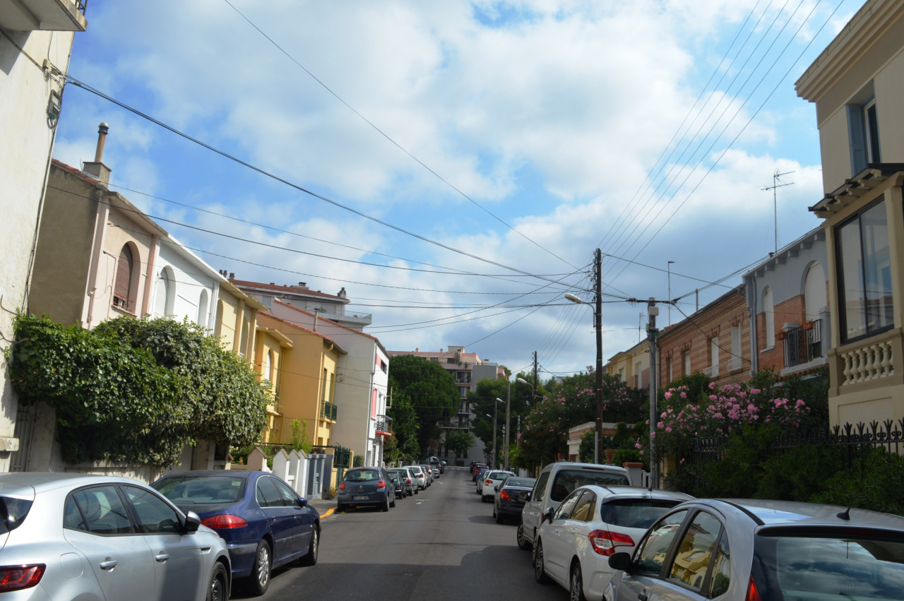 Description : Habitat en bande, avec composition similaire de la façade : briques et crépis, accès au garage en pente sauf pour l'habitation 8 et 10.