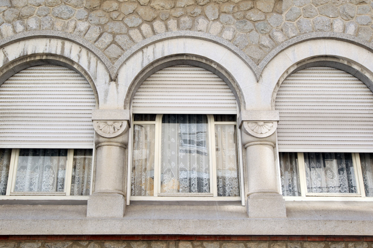 Description : Inspiration régionaliste : Baie de loggia et triplet de baies avec colonnettes pour les ouvertures, murs en moellons de granits et petites arcatures lombardes en briques.