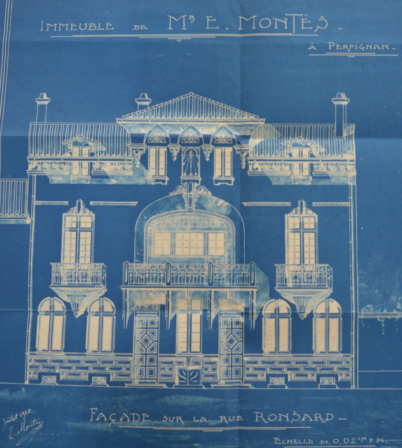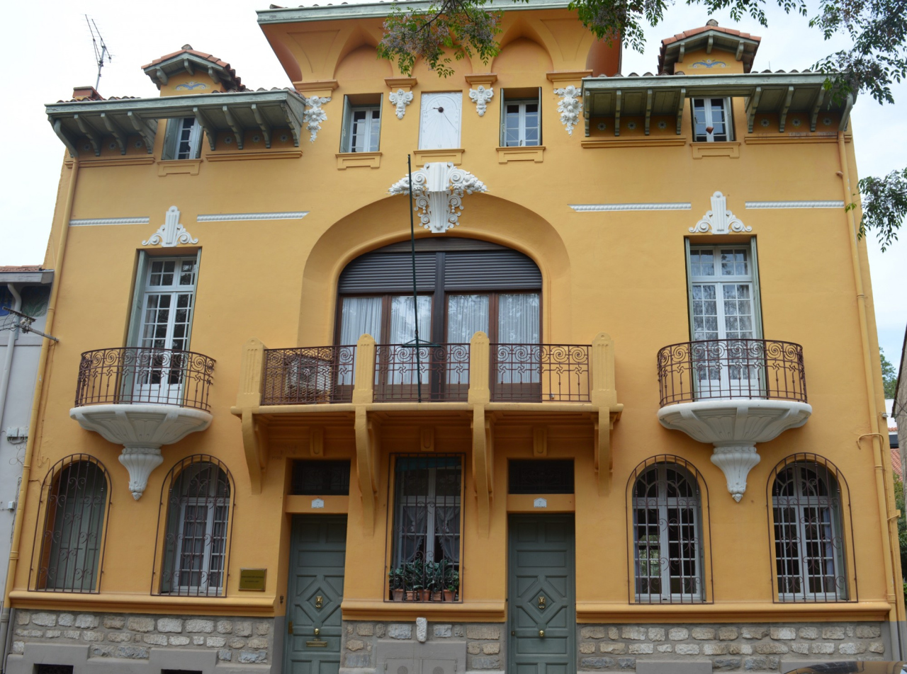 Façade principale inspirée de l’architecture Art nouveau, avec les balustres circulaires du premier étage et les éléments décoratifs sculptés.