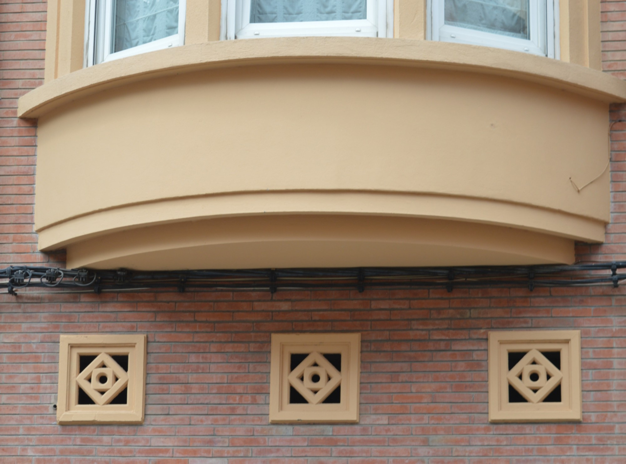 Des motifs décoratifs de losanges sont visibles au rez-de-chaussée.