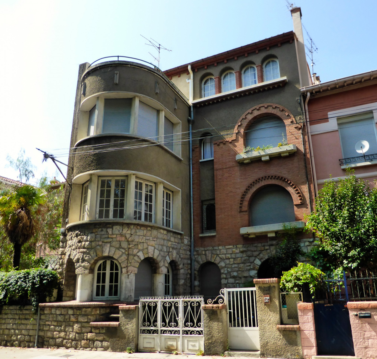 Influence régionaliste : Arcatures avec colonnes en briques au dernier étage, arcades surmontées de motifs décoratifs en briques et pierres apparentes.