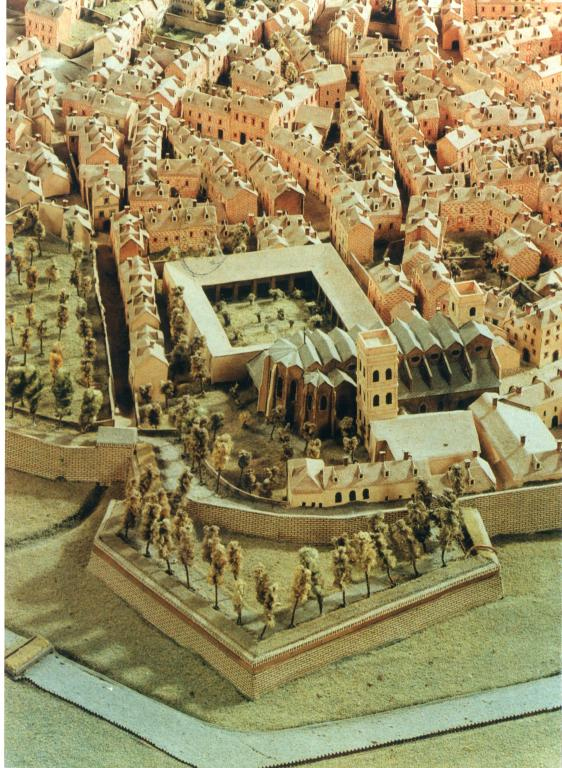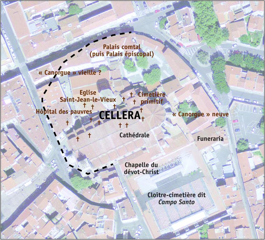 La vieille église St-Jean, dite « le-Vieux », du 10e siècle est le dernier monument du temps des comtes de Roussillon. Au 14e naquit le grand Saint-Jean gothique : Saint-Jean-le-Neuf, future cathédrale, le cloître-cimetière dit Campo Sant , sa chapelle funéraire, la Funeraria et la chapelle du Dévot-Christ au 16e siècle. Cet ensemble cathédral écrasa en partie le Perpignan primitif : le cimetière et des habitations. Le château des comtes de Roussillon devenu résidence épiscopale au 14ième siècle fut modernisé plusieurs fois avant de disparaître. La résidence des chanoines, la « Canorgue », fut très remaniée après la Révolution française. L’hôpital fut détruit à la fin du 19e siècle pour la réalisation de la Cité Bartissol. Sa fontaine de 1431 a été déplacée en face du porche de la cathédrale.