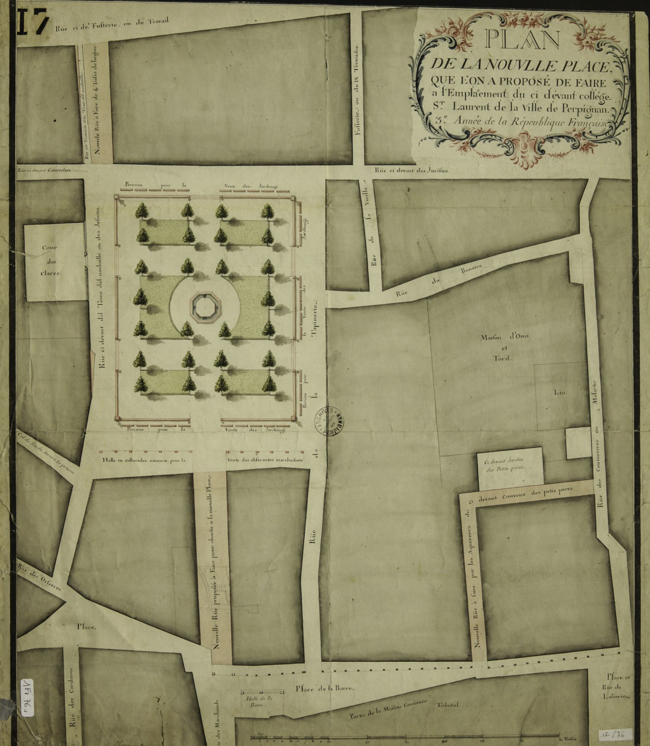 Les Jésuites édifièrent au 17e siècle, après avoir racheté plusieurs îlots de maisons médiévales, un immense couvent qu’ils abandonnèrent lors de leur expulsion, en 1774. La place de la République vit le jour dans le premier tiers du 19e siècle sur les terrains laissés libres depuis 1794 par la destruction de leur église, dédiée à Saint-Laurent, des bâtiments conventuels, du cimetière et des jardins. Occupée par un marché depuis lors, elle constitue un espace de sociabilité privilégié des Perpignanais. Le théâtre municipal fut édifié en 1812 sur la cour et les salles de classe du collège désaffecté de ces religieux. Avec sa petite salle à l'italienne, il a gardé un décor d'avant-scène du 19e siècle.