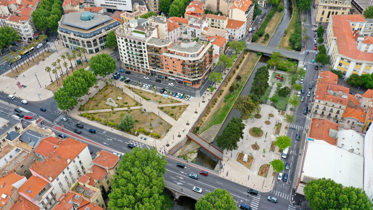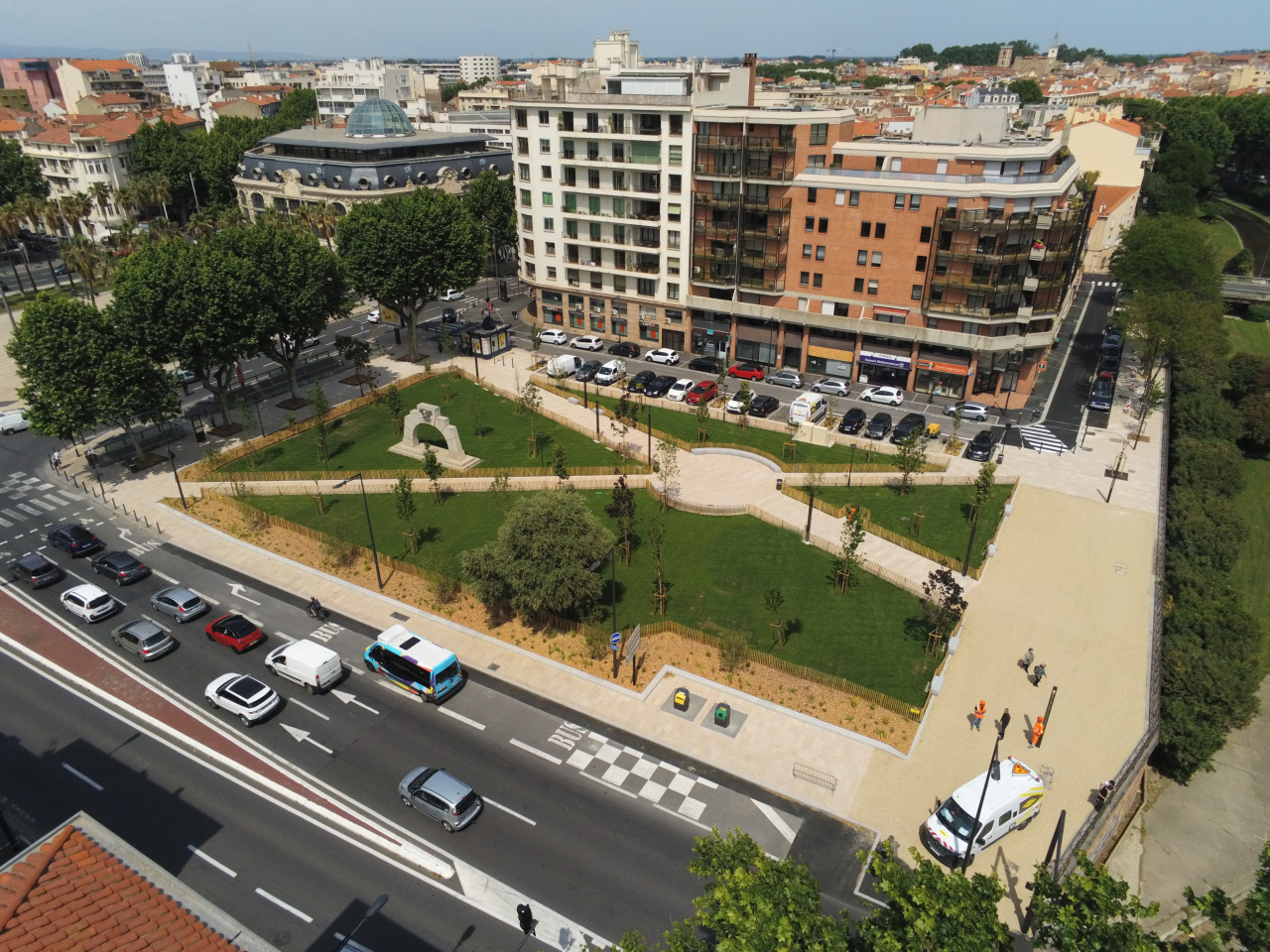 Valorisation du square Jeantet Violet situé en entrée de Ville avec la suppression des quatre parkings en sous sol et transformation de ce lieu à dominante végétale qui s'articulera parfaitement avec le Jardin Terrus par la création d'une future passerelle. L'aménagement a consisté à :